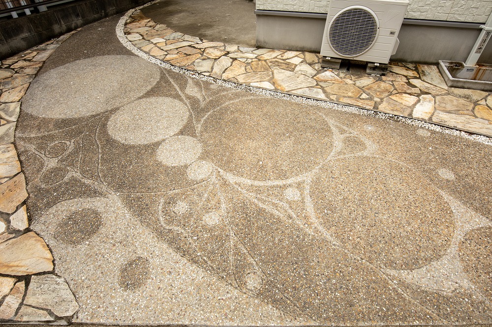 タイルと石の洗い出しで模様と絵柄を描いたオリジナルの駐車場です。